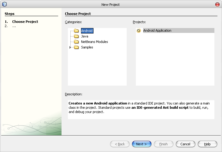 Что же, попробуем создать первый тестовый проект Android приложения и заодно настроим все необходимые параметры. Для этого вызываем пункт меню File --> New project. В появившемся окне выбираем тип проекта Android --> Android Application (рисунок 12) и нажимаем кнопку "Next". Теперь нам придется заполнить несколько полей: