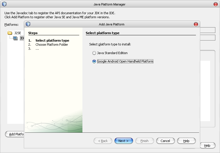 Красная строка в названии платформы (рисунок 13) указывает на то, что местоположение платформы не задано. Исправим это недоразумение. Нажимаем кнопку "Manage platforms". В появившемся окне (рисунок 14) нажимаем клавишу "Add platform", в новом появившемся окне (рисунок 15) выбираем пункт "Google Android Open Handheld Platform" и жмем "Next". Нам нужно будет указать местоположение платформы Android (у меня оно было такое: "C:\Program Files\Android\android-sdk-windows" у вас наверняка что-то наподобие того). Затем нужно будет выбрать версию платформы (рисунок 16) и нажать на кнопку "Finish", а затем "Close". Красная надпись должна исчезнуть. Снова нажимаем на "Finish" для окончания создания проекта. Автоматически должно открыться окно редактирования файла MainActivity.java Исправим его исходный код на такой: