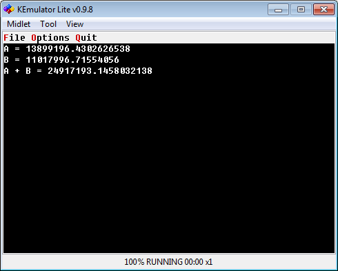 * По результатам тестирования (на нескольких моделях телефонов), средняя скорость выполнения функций для чисел на 16 знаков состовляет 1.1 - 1.5мс. То есть в секунду можно выполнять около 500 операций с такими числами, до того как мидлет станет подлагивать.