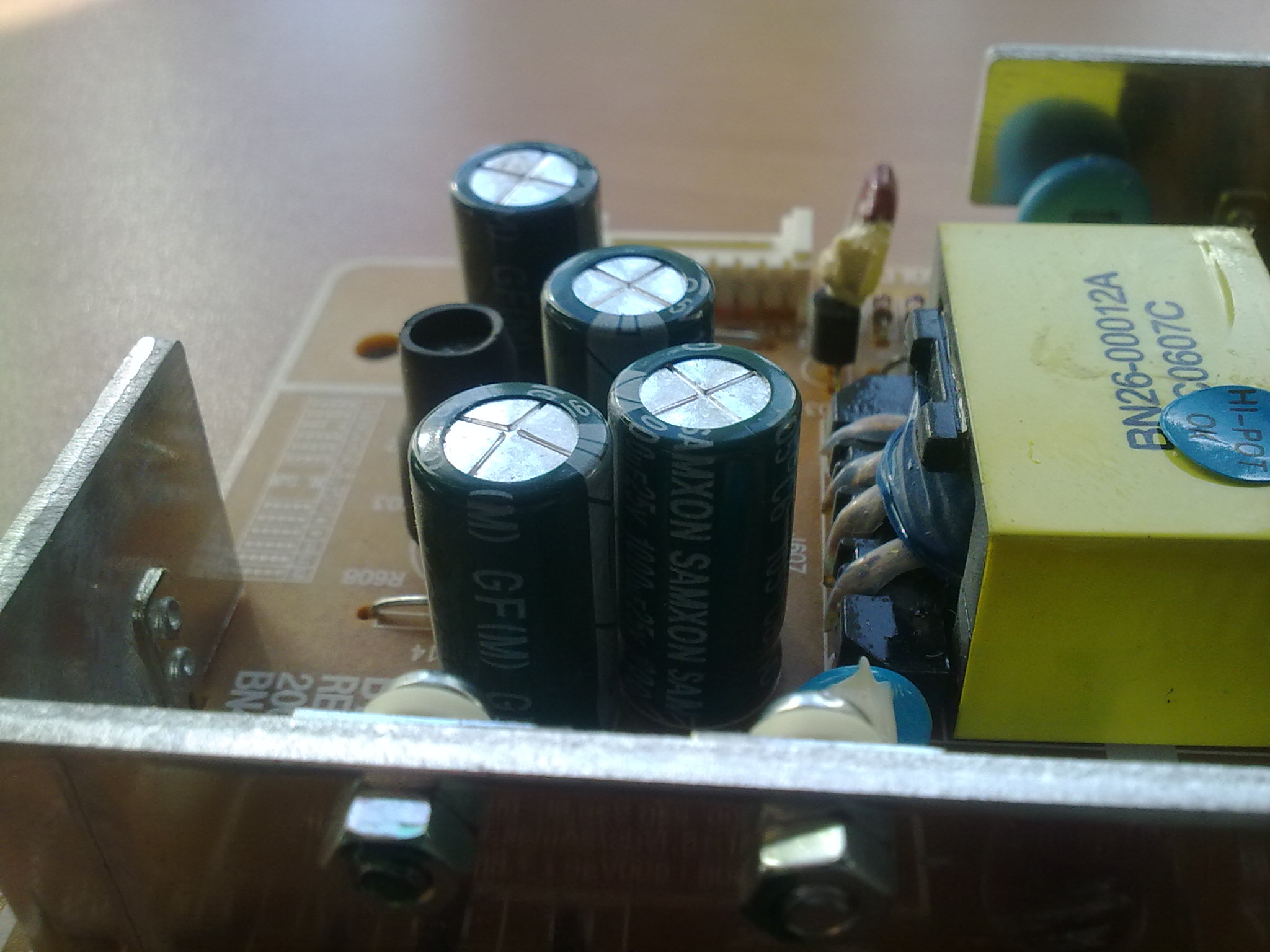 1. Купил на замену три конденсатора, вместо 820μF 25V взял 1000μF 25V (таких два), вместо 330μF 25V взял 470μF 25V. Такие были в магазине.