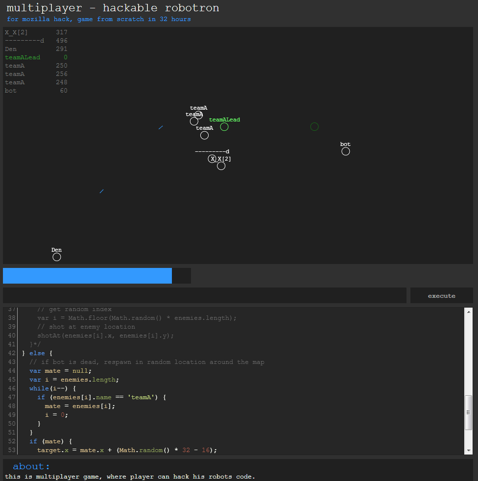robotron - это мультиплеер игрушка про роботов которые управляются Java-Script'ом на стороне клиента, но результат input'а шлётся на сервер.