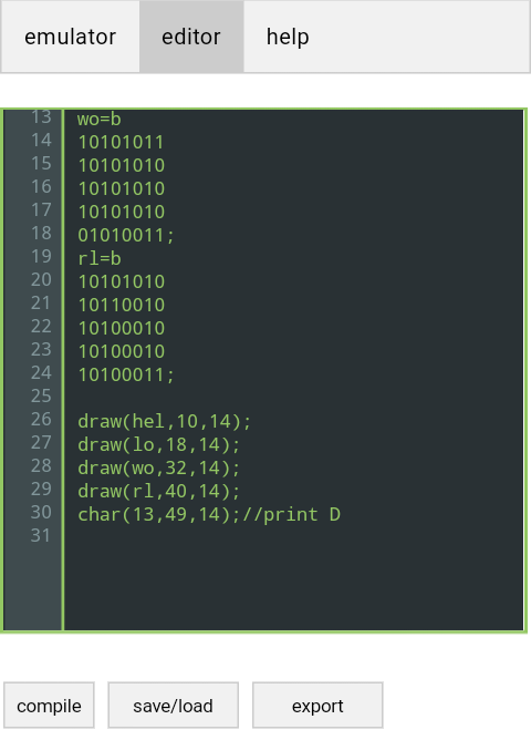 Эмулятор широко известной в узких кругах виртуальной машины chip-8, а так же редактор исходного кода с возможностью компиляции в машинный код. Другими словами можно играть в готовые ромы, а можно писать свои. В качестве языка программирования используется basic